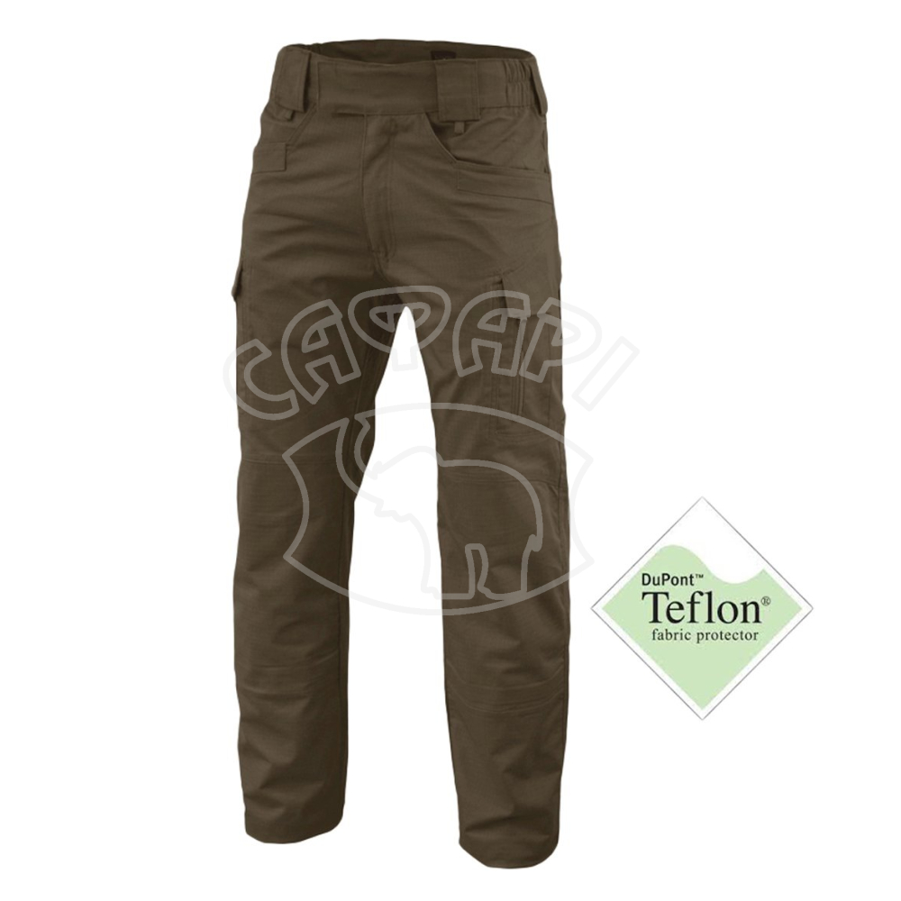 Тканина легка, приємна до тіла та швидко сохне. Покриття Teflon захищає матеріал від промокань та забруднень. Застібаються штани на блискавку. Вона прикривається вітрозахисним клапаном на липучці. Пояс з еластичними вставками. Для носіння ременя передбачені широкі петлі. Вони посилені та розраховані на носіння навантаженого спорядженням пояса. Штани оснащені відсіками для наколінників.