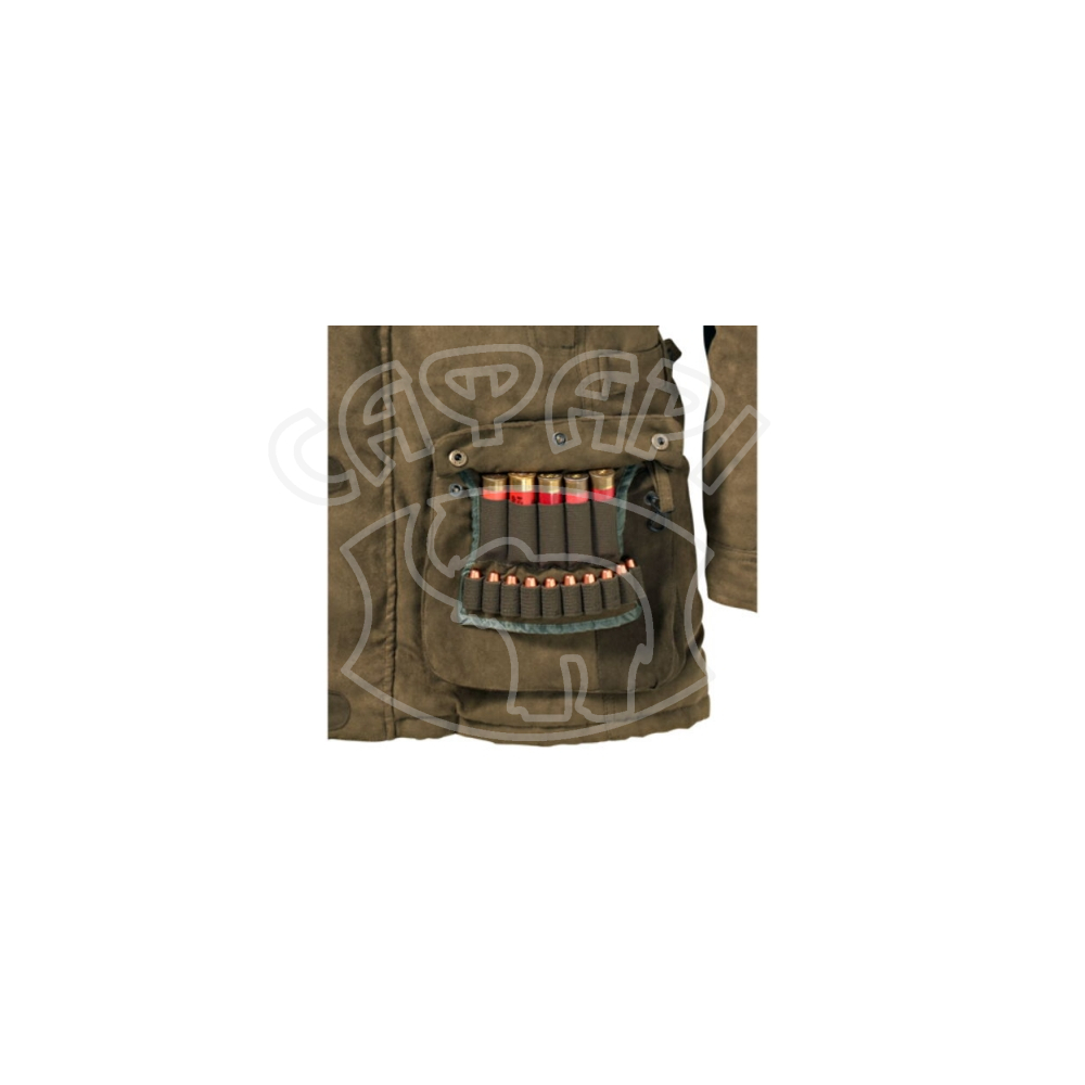 Теплая куртка Percussion Grand Nord с замшевой отделкой с изящной контрастной строчкой на плечах и локтях. 2 больших карго кармана с встроенными патронташами, большой карман для дичи с защитой от протекания из ПВХ, 2 боковых кармана с водонепроницаемыми молниями, скрытый карман внутри с ветровым клапаном для выхода кабеля от наушников, делают эту куртку идеальным вариантом одежды для охоты. Воротник с высокой стойкой и регулируемые манжеты с внутренними манжетами из неопрена, а также съемный капюшон на утепленной подкладке обеспечивают надежную защиту от холодного ветра и комфорт при любых погодных условиях. Водонепроницаемая мембрана создает необходимую защиту от влажности. Два отверстия в подмышках с водонепроницаемыми молниями способствуют теплообмену при длительной охоте.
